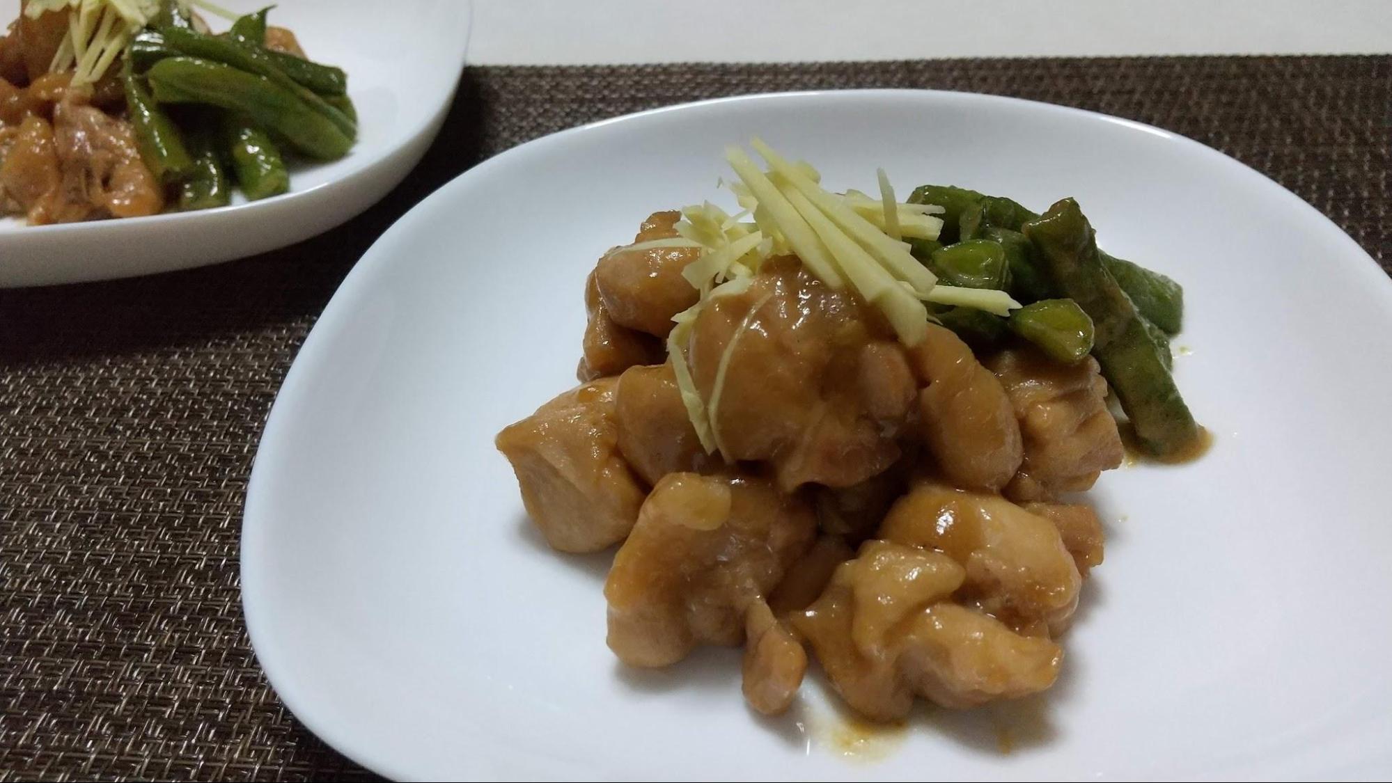 フライパンに油をしいて熱する。臭みが出ないように最初におろし生姜で鶏肉を炒める。軽く1?2分、全体的に色が変わり火が入る程度でよい。