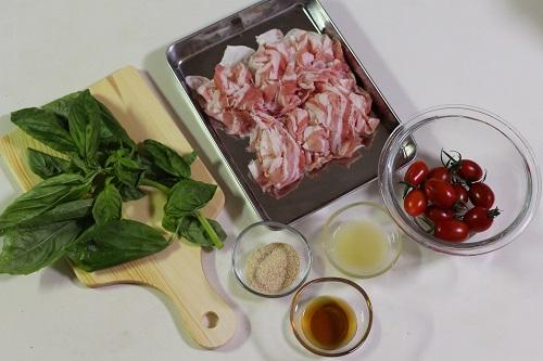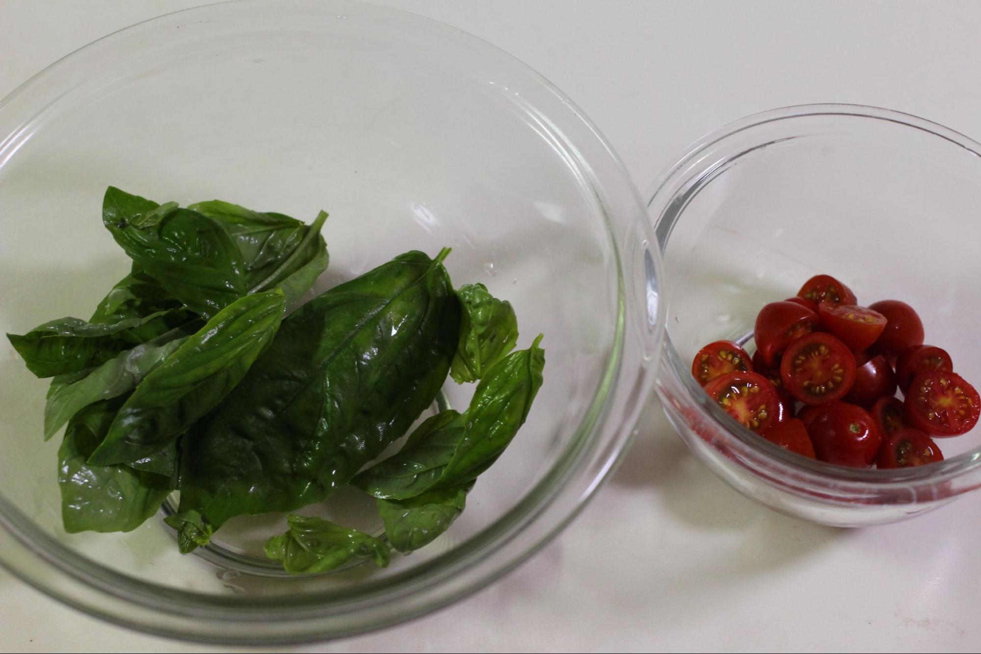バジルの葉は食べやすい大きさにちぎる。プチトマトはヘタをとり、半分に切る。