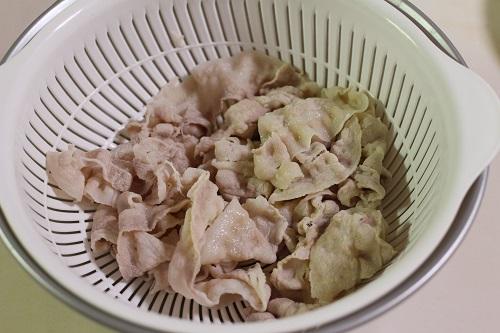 鍋に湯を沸かし、沸騰したら弱火にする。豚肉を1枚ずつ広げながら、お湯にさっとくぐらせる。茹で上がったらザルに上げ、水気をきって冷ます。このとき、氷水を使わずに自然に冷ますことで、肉が固くならずに美味しく仕上がる。