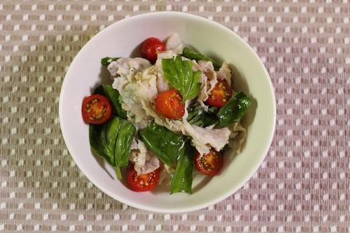 ボウルにプチトマト、バジル、豚肉、ドレッシングを入れる。全体をよく和えて完成だ。