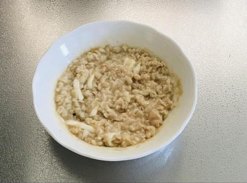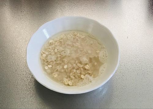 皿にオートミールと水を入れて混ぜ、顆粒出汁の素も加える。600Wの電子レンジで3分加熱する。