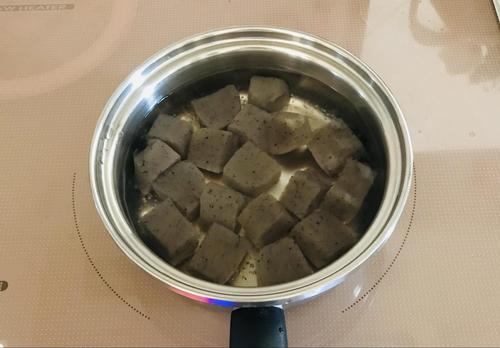 沸騰させたお湯にこんにゃくを入れ、3分程度茹でたらお湯を切る(アク抜き、臭み消しのため)。