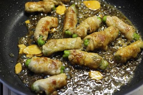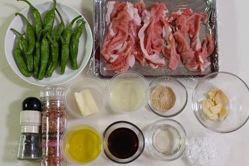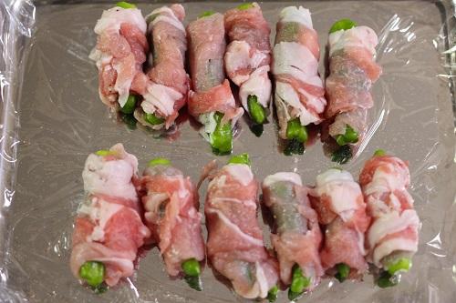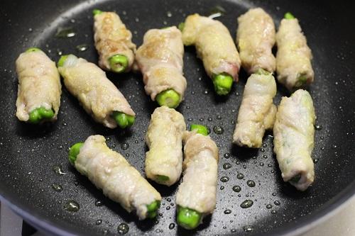 豚肉に塩、こしょうをまぶし、ししとうに豚肉をクルクルと巻いていく。焼く時に剥がれないように、しっかりと押さえながら巻くとよい。巻き終わったら、全体に片栗粉をまぶす。