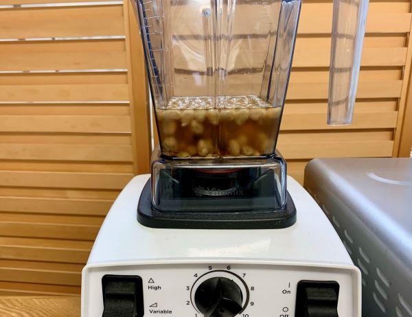 ミキサーに出汁半量と大豆(残ったつゆごと)を入れ、完全になめらかになるまで徐々にハイスピードになるよう調整しながら、3~4分攪拌する。残りの出汁を加えたらまた少し回転させ、よく混ぜておく。