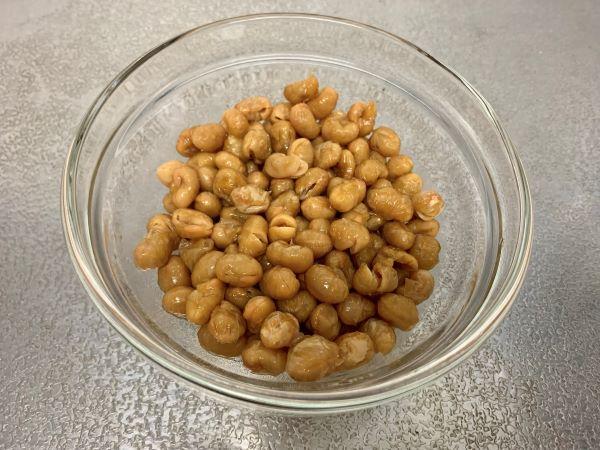 水煮大豆や蒸し大豆を家庭用食品乾燥機にかけ、2時間程度乾燥させる。カラカラになる直前で取り出し、めんつゆ45ccに浸す。乾燥度合いにもよるが、30分程度で写真のようにふやけてくる。長く浸しておいても問題ない。