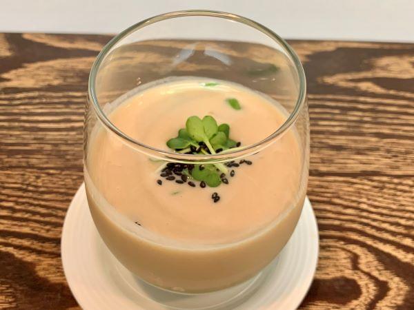 ガラスの器にポタージュを注ぎ、トッピング用の野菜を乗せる。ごまを指でひねってつぶしてふりかけ、できあがり。こちらの器には100cc程度と軽めに注いでいるが、上記材料での全体のできあがり量は約400cc。かなり濃厚な「食べる」スープになっているので、お好みで濃度調整していただきたい。