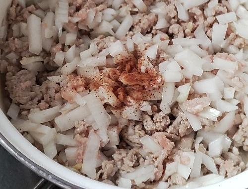 鍋にひき肉、玉葱、にんにく、しょうがを投入して弱火にかける。肉の脂がにじんできたらナツメグを加えて、混ぜながら炒める。焦げ付きそうな場合、水を30ml程度加える。