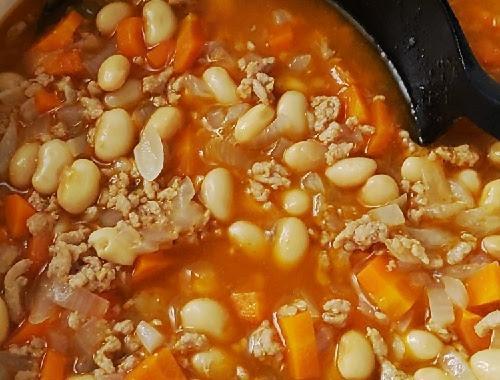 玉葱が透明になってきたら人参、水、酒、ローリエを加える。沸騰してきたらめんつゆと大豆を加えて10分程度煮込む。