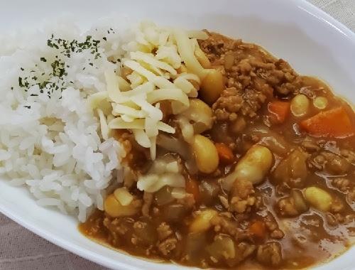 皿に盛り付け、シュレッドチーズをトッピングする。