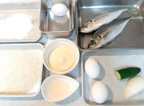 下処理をしたアジの水分を拭き取る。塩コショウ少々(分量外)をふりかけ、強力粉・卵・パン粉をつける。