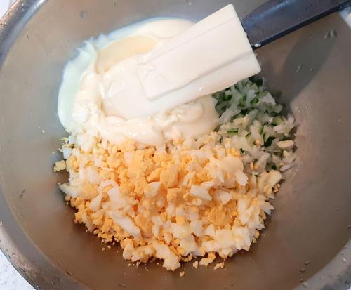 茹で卵、玉ねぎ、胡瓜、マヨネーズとレモン汁をボウルで混ぜ合わせる。