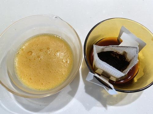 卵は溶いておく。コーヒーはお湯を注いで濃いめに抽出する。オーブンは180度に予熱する。