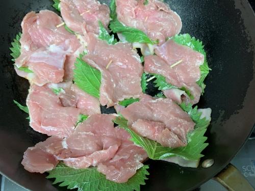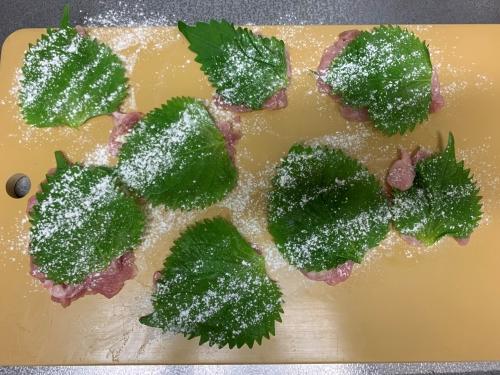 白みそを酒でゆるめて肉に塗り、その上に大葉を1枚ずつのせる。さらに小麦粉を薄く振る。