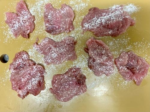 Step.1 肉を8枚に切り、コショウと小麦粉を振る