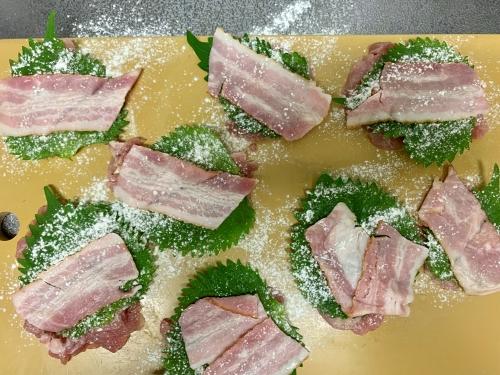 ベーコンは最初から切れているもの(いわゆる切り落とし)もあるが、大きさが揃っていないと今回は使いにくい。長いものなら、1枚を3等分し、大葉の上にのせて爪楊枝で止めておく。
