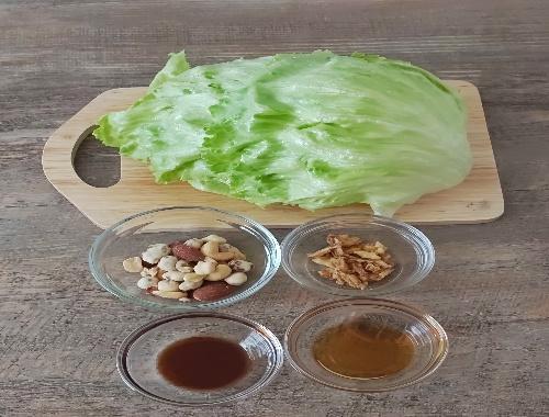 レタスは洗った後ペーパーで水気をふき取り、器に直接ちぎり入れる。砕いたナッツ、フライドオニオンを加え、全体に絡めるように混ぜる。しょうゆとごま油を回し入れ、味を整える。最後にサラダチキンを乗せて完成。