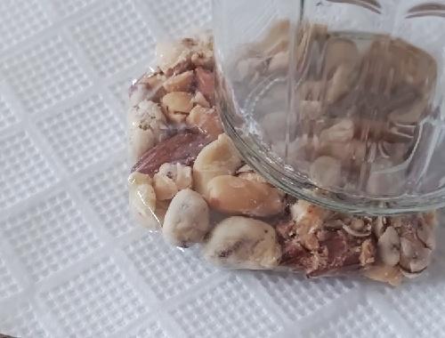 ミックスナッツは袋ごと、又はラップに包み、瓶の底で砕いておく。荒く潰す程度に砕いたほうが、食べるときの食感が楽しめる。サラダチキンは、食べやすい大きさに割く。