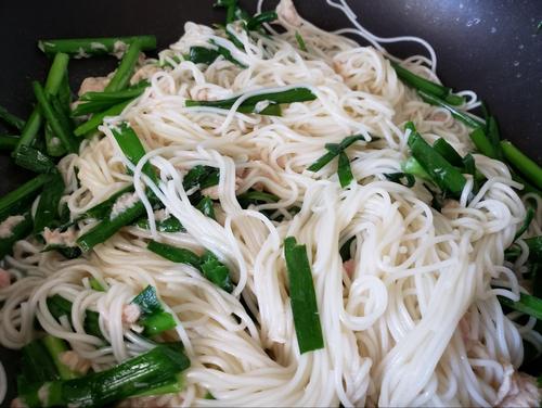 そうめんを入れたら、にらとツナと和えるだけのイメージでさっと炒める。白だしを全体に回し入れ、少し混ぜたら完成だ。