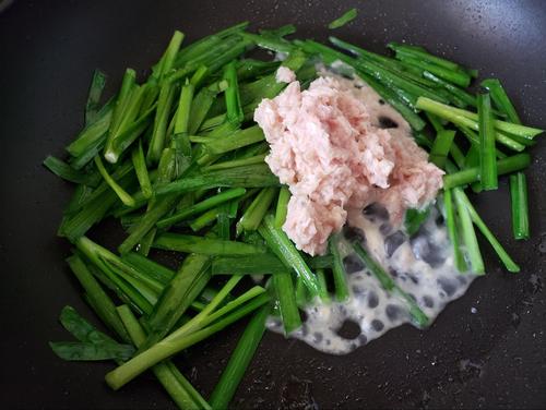 フライパンに油をしいて、強火にかけにら、にらとツナを入れさっと炒める。