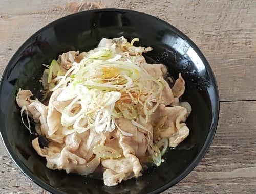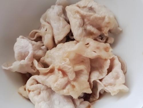 鍋のお湯が沸騰したら、豚肉を広げるようにしゃぶしゃぶの要領で加熱する。加熱したら、液体スープを溶かした器に入れ、たれを絡ませておく。肉の加熱が終わったら、鍋のお湯を再度沸騰させてアクを取り除く。