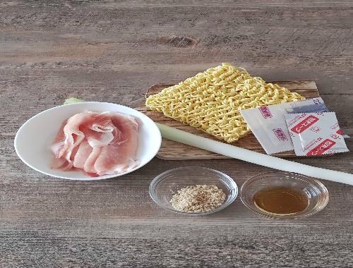 麺の袋に記載されている規定量の水をはかり、鍋に入れる。鍋を中火にかけ、酒を入れておく。器に付属の液体スープを半袋程入れ、鍋の湯を大さじ3程度を入れて溶かしておく。長葱は薄く斜めスライスにし、別の器に白すりごまとともに入れておく。