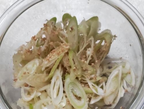 アクを取り除いた鍋のお湯で、インスタントラーメンを規定より1分短く茹でる。その間、小鍋にごま油を入れ、火にかける。油がふつふつしてきたら火を止めて、長葱の器に注ぐ。「ジュワッ」と音がするので、油が熱いうちに長葱全体に絡ませておく。