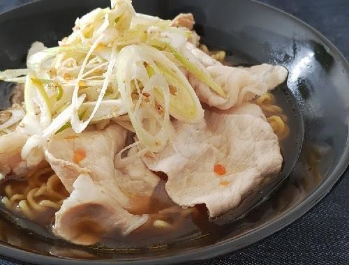 麺が茹で上がったら火を止め、残りの液体スープを鍋に注ぐ。この時、肉を漬けてあるスープも鍋に投入する。麺を器に盛り、スープを注ぐ。肉を放射線状に盛り付け、長葱を中央にこんもり盛り付けたら完成。