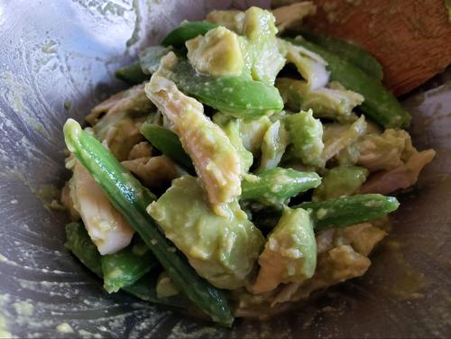 一口大に裂いたサラダチキンを加えて混ぜる。アボカドは食感が残るくらいに軽く潰し、なめらかにしていこう。