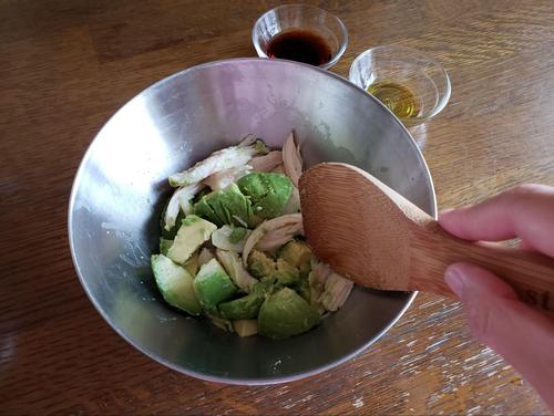 Step.2 チキンを加えて、アボカドを軽く潰す
