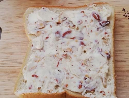 あえたクリームチーズをバターナイフでパンに塗る。塗り終わったら上からもう一枚のパンを乗せ、好みでパン耳をカットする。
