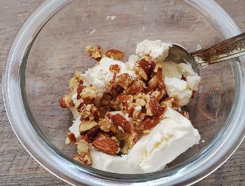 アーモンドはラップに包み、瓶の底で粗目に砕いておく。クリームチーズは使う10分前くらいに冷蔵庫から出しておく。