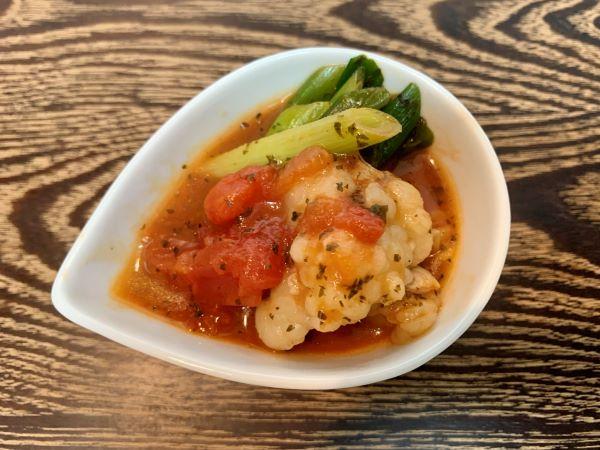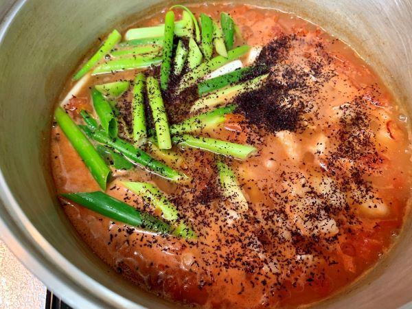 鍋のスープを中強火で5分程度煮立て、輪切りの唐辛子、シマチョウ、ネギを加える。