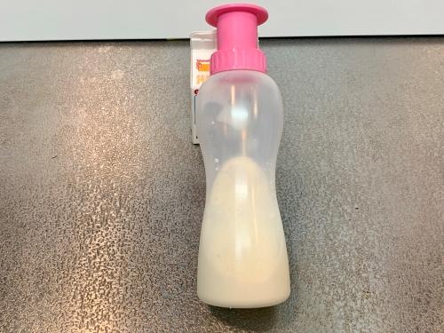少量の生クリームを泡立てるときには、泡立て器を使うと器具に付いたクリームの方が多くなり、歩留まりが悪い。100均で販売されている泡立てボトルを使うと、できあがったらそのまま絞り出すこともできて便利だ。