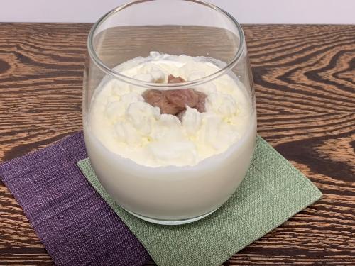 冷えて固まった豆乳プリンの上に金時豆の餡を乗せる。周りに生クリームを絞り出して飾る。