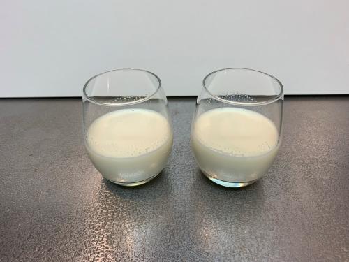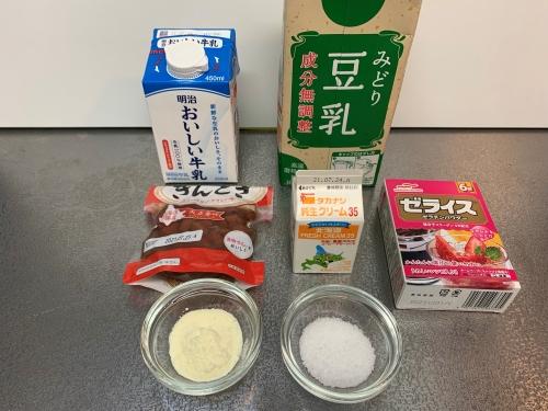 牛乳と豆乳を110ccずつボウルに入れ、砂糖小さじ1を加えてレンジで40度位に温めたら、ゼラチン液と混ぜ合わせる。豆乳のクセが気にならないなら、220cc全部を豆乳にしてもよい。カップに半分ずつ分けて注ぎ、冷蔵庫でしっかり固まるまで冷やす。