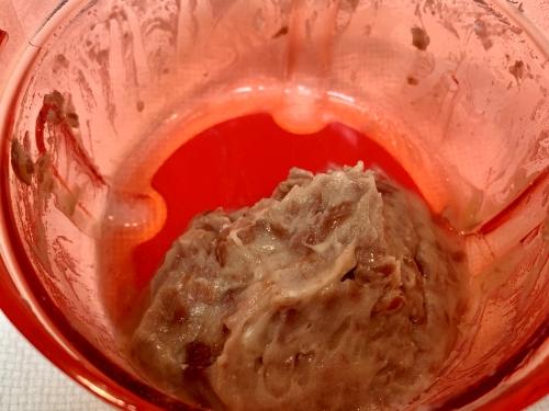 金時豆をチョッパーに入れ、ミルクパウダーと水(またはブランデー)を加えて荒つぶしする。なめらかな餡を作りたい場合はブレンダーを使えばよいが、少量の場合は器具の間に挟まって目減りするので注意。