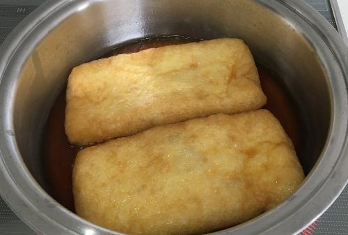 油揚げがキレイに仕上がるように、鍋は油揚げがすっぽりと入るサイズがよいだろう。