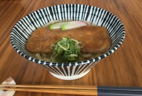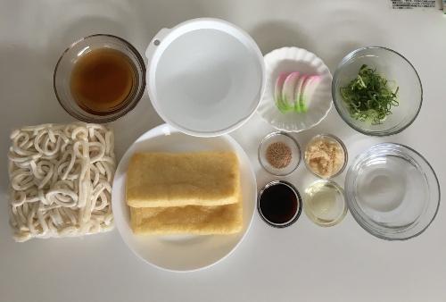 器にうどんを入れ、出汁をかける。油揚げ、かまぼこ、ねぎをトッピングすれば完成だ。