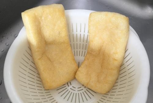 Step.1 油揚げに熱湯をかけ、キッチンペーパーで余分な油をとる