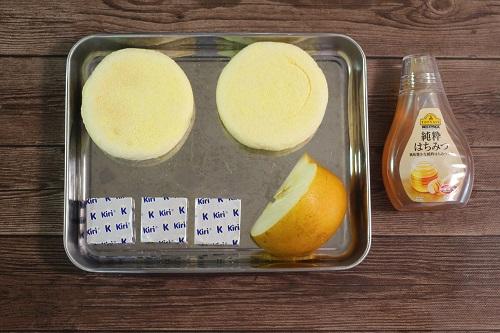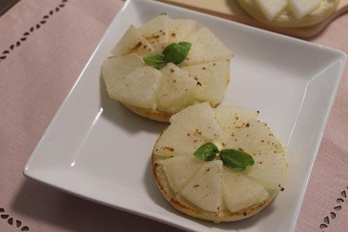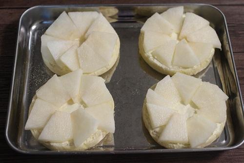 イングリッシュマフィンは半分に割る。半分にしたイングリッシュマフィンの上にクリームチーズをまんべんなく塗り、梨を並べる。