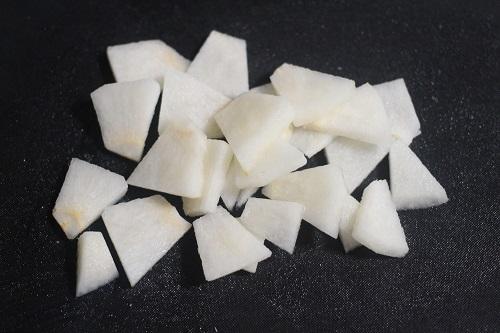 梨は皮を剥き、2~3mm幅のいちょう切りにする。クリームチーズは冷蔵庫から出し、室温に戻しておくと扱いやすい。