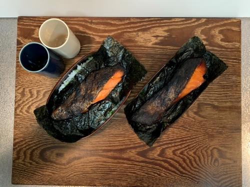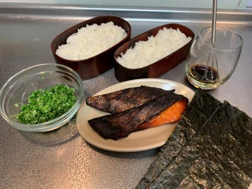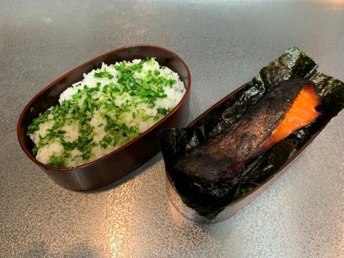 大きな弁当箱には250g、小さな弁当箱には200gのごはんを盛り、水菜の浅漬けを散らす。料理用ハケで、醤油とみりんを海苔の裏に隅々まで塗る。海苔をごはんの上に置き、最後に鮭を乗せてできあがり。お好みで、野菜のお浸しなどの副菜を添える。