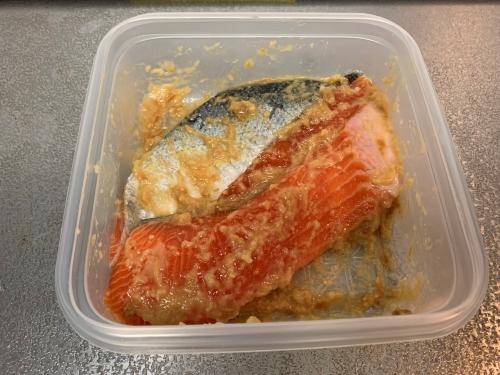密閉容器の中で塩麹と奈良漬の酒粕をよく混ぜる。生鮭を入れて1晩漬けこむ。
