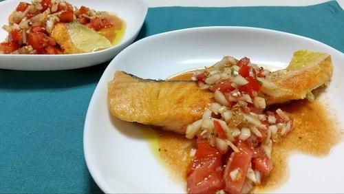 サーモンが焼けたら皿に取り、冷蔵庫で冷やしておいたソースをかけ、パセリを振って完成。