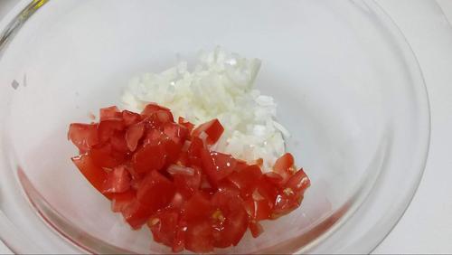 玉ねぎ、トマト(皮付きのまま、ヘタは除く)を粗くみじん切りにする。食感も楽しみたいので、細かく切りすぎないのがポイントだ。