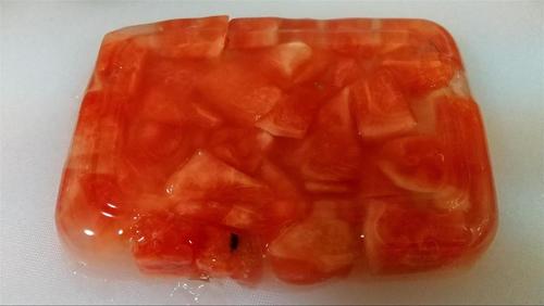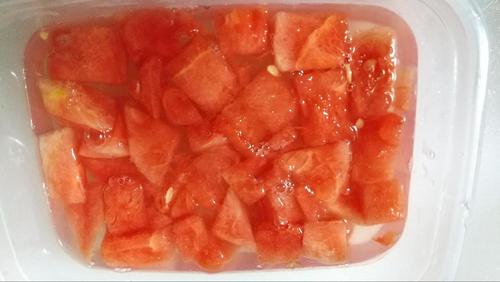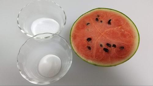 700Wの電子レンジで4分程度加熱し沸騰させたら、容器に入れたスイカの中に流し入れる。固まるまで待つ。