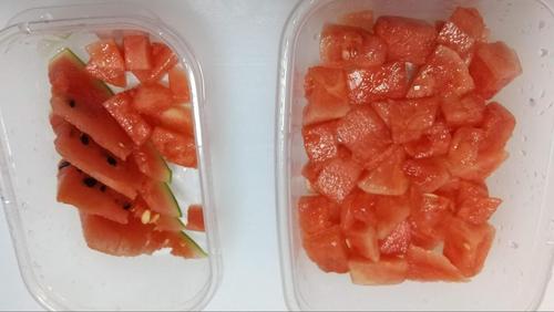 スイカは、ゼリー用と飾り用に分ける。ゼリー用は皮を除いてひと口大に切る。タネがあると食べにくいので、見える所にあるタネはできる限り取り除く。飾り用は皮を除かずに、好きな形に切っておく。