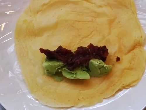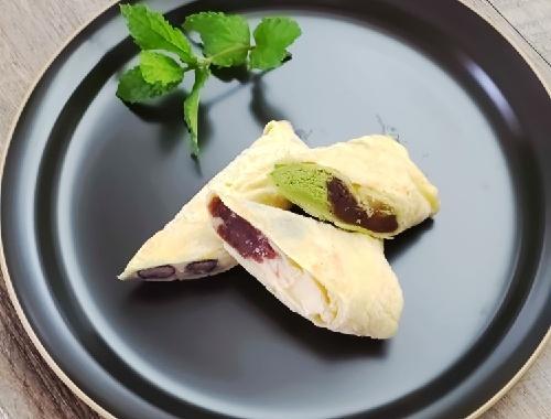 ラップの上に冷めた生地を広げ、アイスクリームとあんこ、または冷凍ブルーベリーなどを乗せて包む。生地の中央よりやや下に具材を乗せ、両サイドを折った後、下方から巻き込むように包んでいく。