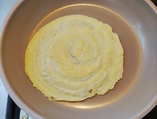 フライパンに薄く油をひき、強めの弱火にかける。生地をフライパンに注いだら、お玉で薄く伸ばして焼く。裏面が焼けたらフライ返しで返し、両面焼く。バットまたは皿にキッチンペーパーを敷き、焼けた生地をのせて完全に冷ます。