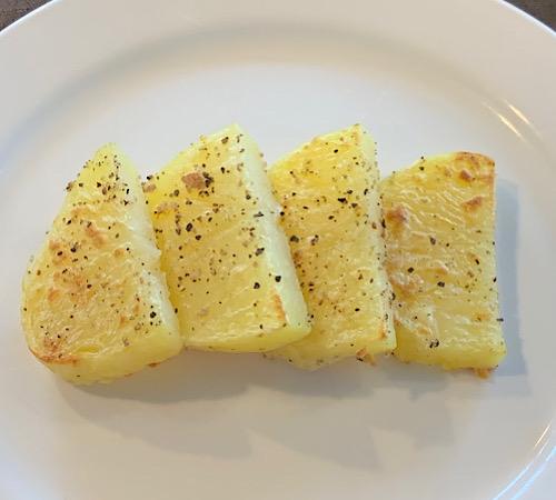じゃがいもは洗って皮と芽を除き、食べやすい大きさに切る。耐熱皿にのせてラップをかけ、電子レンジで柔らかくなるまで加熱する。我が家では、根菜類モードで3分程度加熱した。